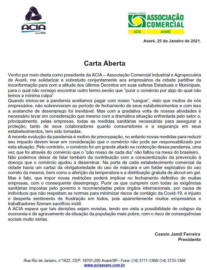A A.C.I.A. Associação Comercial Industrial enAgropecuária de Avaré, vem por meio deste... leia mais
