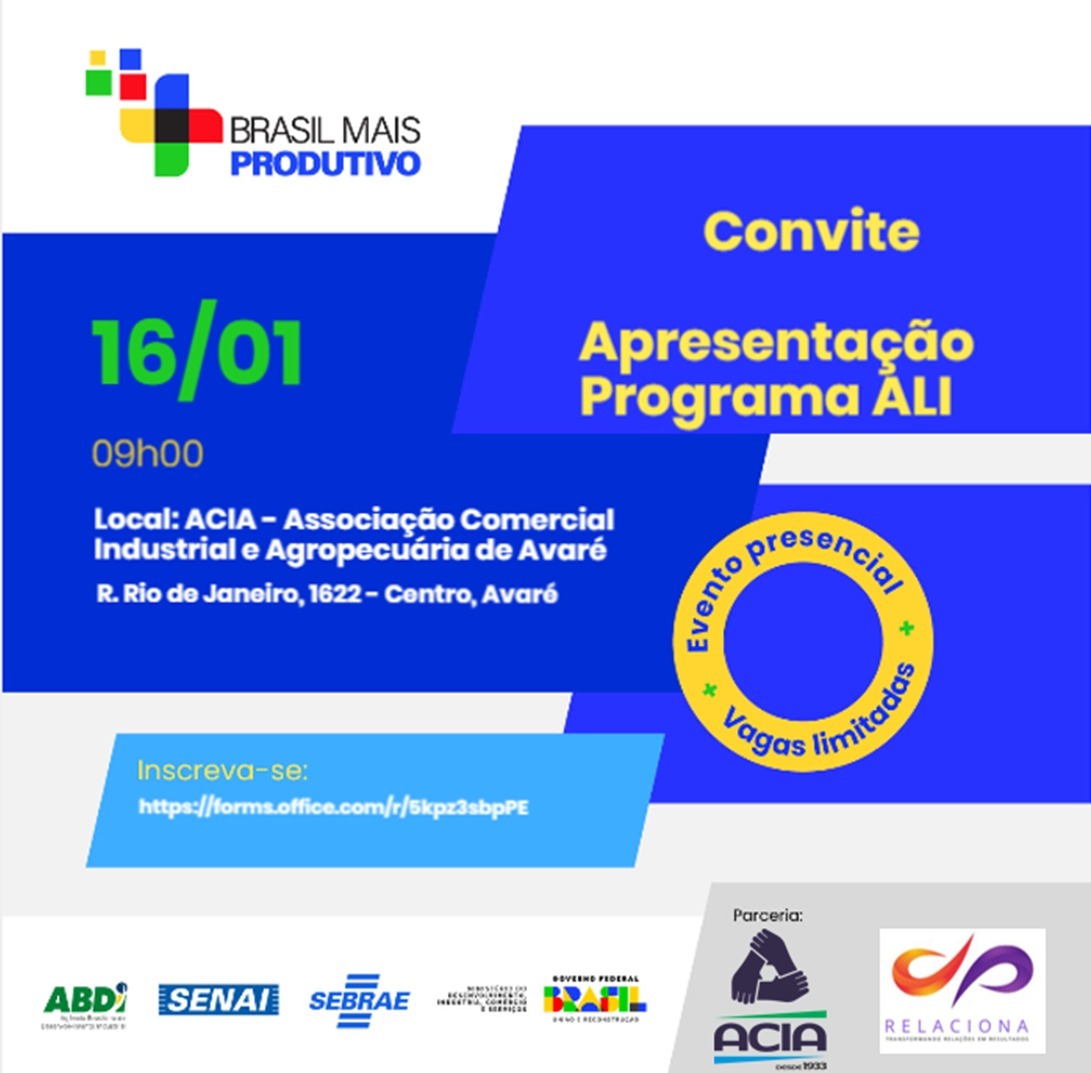 Já conhece os benefícios que o Programa Brasil Mais Produtivo oferece a micro e pequenas empresas como a sua?nn✅O programa é 100% gratuito e leva inovação, redução de custos, produtividade e faturamento.nnDê o primeiro passo para inovar e desenvolver a sua empresa! Venha participar da apresentação do PROGRAMA ALI PRODUTIVIDADE Aproveite agora essa oportunidade!nn⏳ Data: 16|01|2024n Local: Auditório ACIAnRua Rio de Janeiro 1622, Centro, Avaré SP.n⌚️09h00nnFaça sua inscrição: https://forms.office.com/r/5kpz3sbpPE